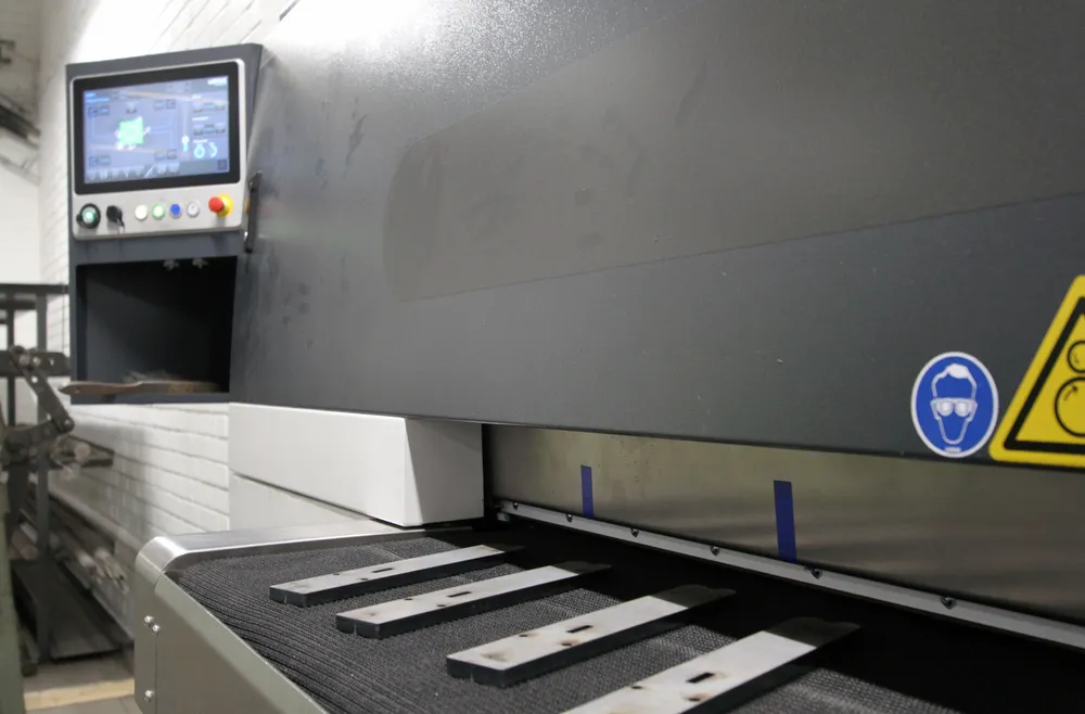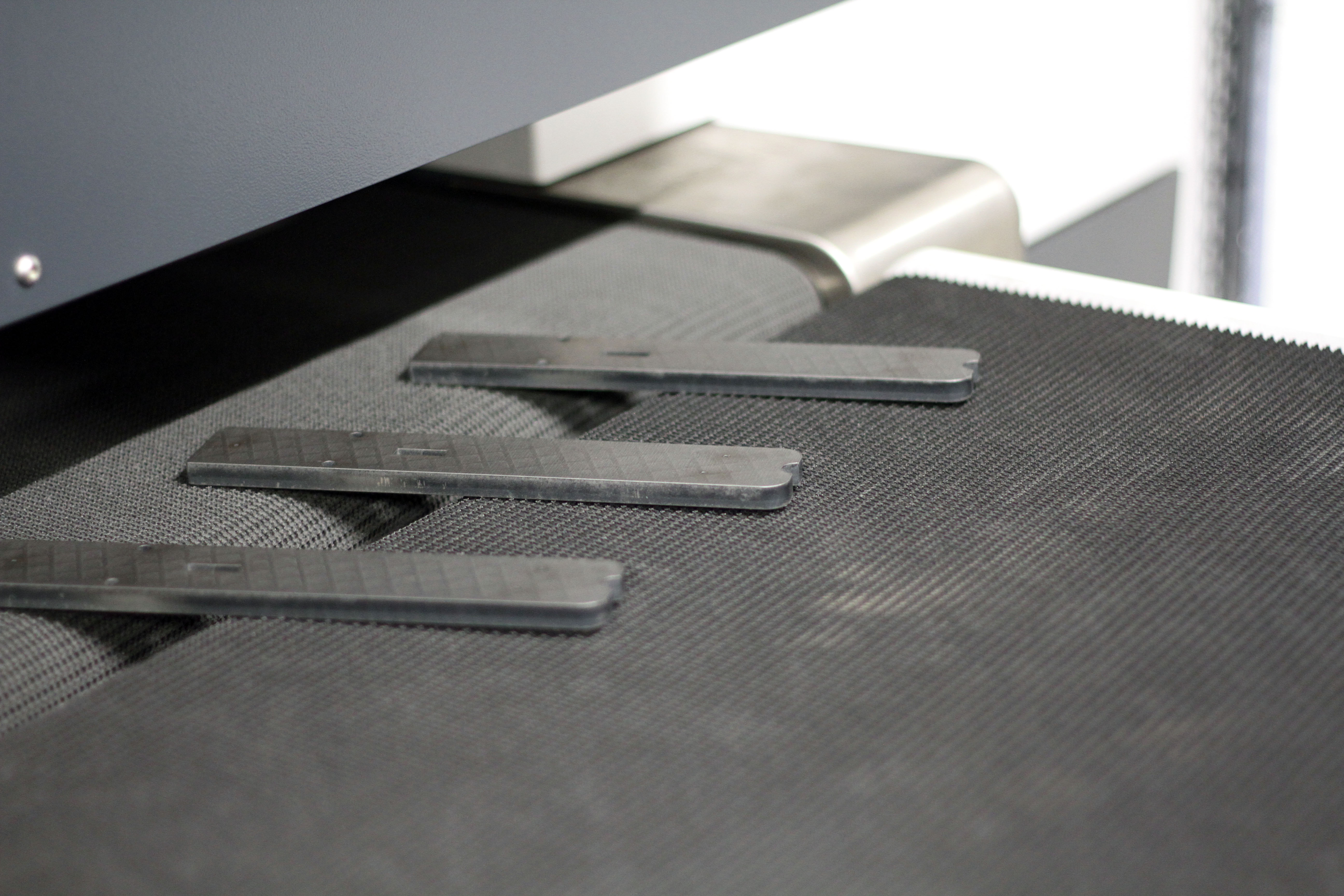 För maskinell avgradning har vi en styrd maskin som med hjälp av slipband och slipklossar kan bearbeta plåtens sidor var för sig eller över- och undersidan i en enda körning.