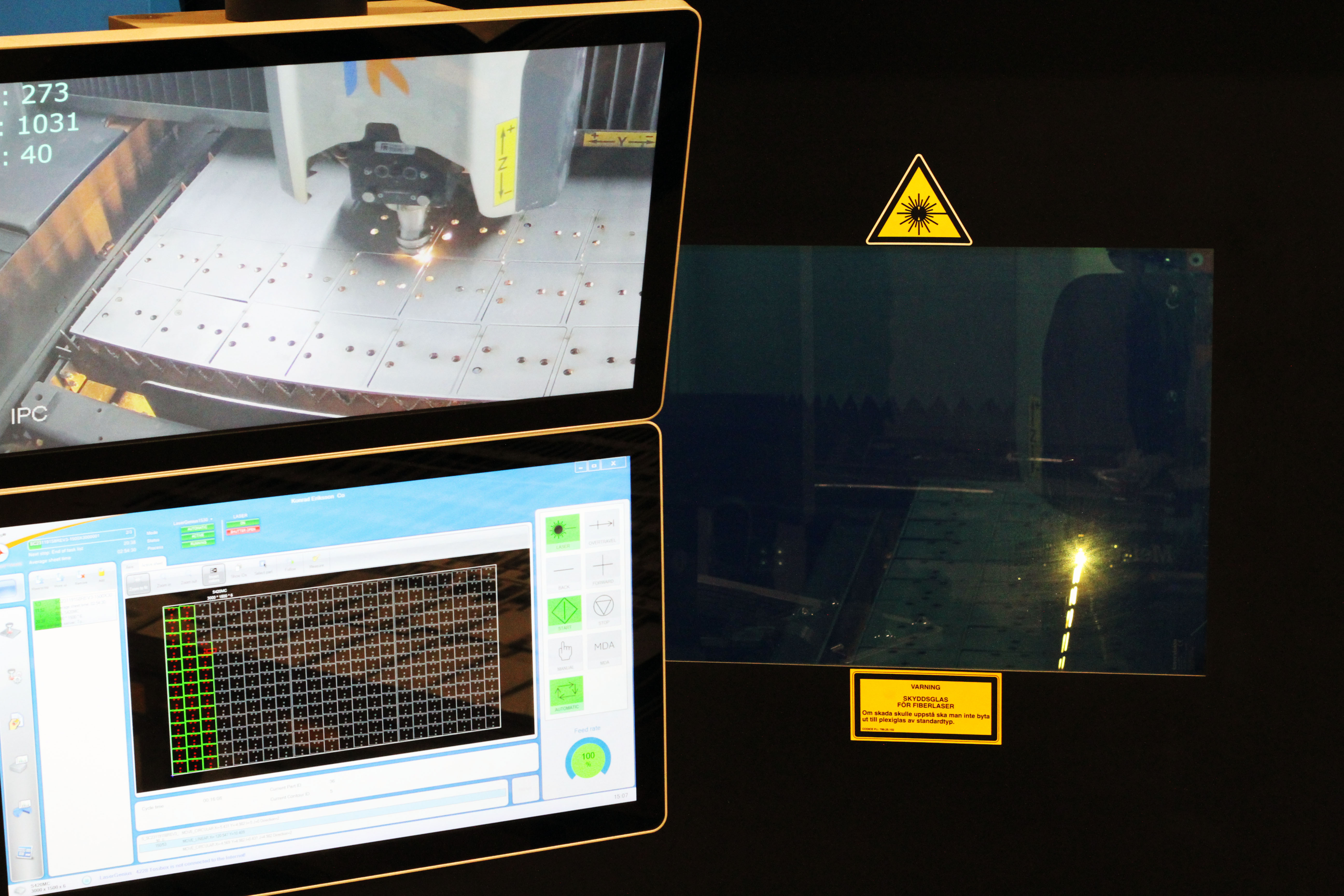 Skärm till lasermaskin som visar pågående skärning samt materialåtgång.